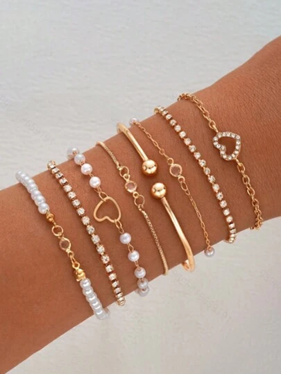 13/11/8/6Pcs Fashionable Elegant Golden Faux Pearl Bracelets & Open Heart Bangle Multi-Piece Jewelry Set For Daily & Party Wear, Layering Accessories, Vintage & Elegant Style - Style 1 - View 9