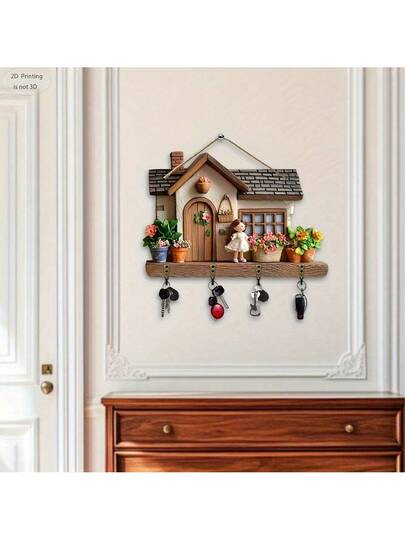 2D Flat, 1pc, Cute Villa- Wooden Multi-Functional Home Key Holder, With Four Metal Hooks- Wall Hanging Decoration, Porch Decoration, Room Decoration, Villa Decoration, Four Seasons Home Decoration, 2D Flat - Multicolor - View 1