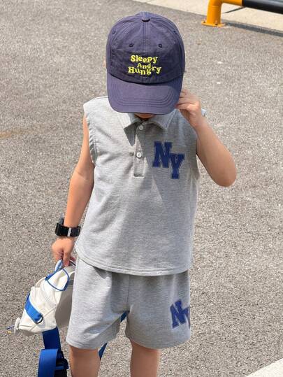 2pcs/Set Young Boy Cute Casual Summer Korean Style Gray Letter Pattern Polo Collar Tank Top And Drawstring Waist Shorts Outfit - Grey - View 1