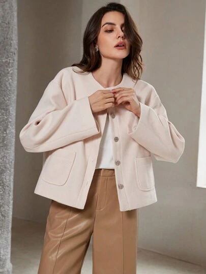 GENKIRA جاكيت جيب ذات أزرار معدنية قصيرة بياقة مستديرة أنيقة عتيقة - لون مشمشي - مشاهدة 1