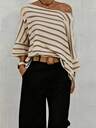 قميص نسائي كاجوال مرتخي بأكمام خفافيش وياقة غير منتظمة مطبوع بخطوط، مناسب للعطلات والتنقل، للربيع والخريف