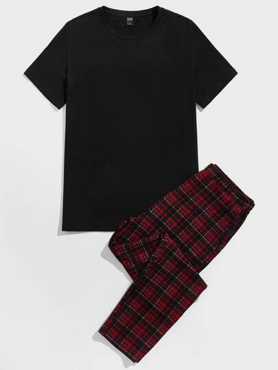 Manfinity طقم بيجامة تيشيرت بياقة دائرية وبنطلون ترتان رجالي