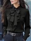 قميص نسائي أنيق بتفاصيل كشكشة وفيونكة بأكمام طويلة - لون أحادي، أكمام طويلة، تصميم أزرار أمامية، مناسب للتنقل والارتداء اليومي، قميص كاجوال | بلوزة أنيقة | تفاصيل كشكشة وفيونكة أسود ربيعي