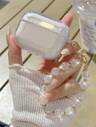 Estuche transparente para auriculares con purpurina, efecto estético de manzana, color rosa bebé, con aplicaciones de cristal y moño. Cadena para auriculares con flor de hielo, pompones y cuentas.