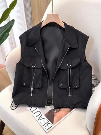 Chaleco sin mangas casual para mujer, con diseño de cremallera personalizada y bolsillos dobles, de tela tejida con forro de doble capa, estilo callejero corto y de moda