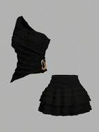 Soleia 3 piezas Conjunto informal de verano de 2 piezas para mujer con parte superior de hombro asimétrico y bajo asimétrico, adecuado para vacaciones, regreso a la escuela, tarde de té, casual, boda en la playa, brunch de graduación, Día de San Patricio, vacaciones de primavera, Pascua, festival de música, elegante estilo boho tropical, marrón, negro, albaricoque