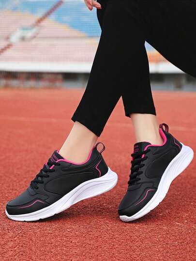 1 Pair Women's Waterproof Sports Shoes, Leather-Like Black, Lightweight Casual Running Traveling Shoes, Summer 2024 New Arrivals, Genuine Product, Simple Solid Color, Comfortable Breathable Running Shoes, Also Available In White Lace-Up Casual Non-Slip Road Running Shoes - Black - View 1