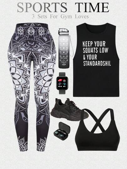 Daily&Casual 1pc Slogan Print Vest, 1pc Crisscross Back Bra And 1pc Full Print Leggings Sports Set - Multicolor - View 1