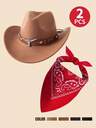 2PCS Western Cowboy Costume, Cowboy Hat Cosplay Accessory, Brown Western Cowboy Hat Dress Up For Kids, Funny Halloween Party Roleplay, Set Of 1 Cowboy Hat, 1 Red Bandanna