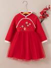 New Years Dress For Young Girl, Autumn/Winter, Plush Fabric With Embroidered Front, Tulle Hem, Chinese Style Mandarin Collar, Chinese Chic Party Dress, Chinese Style