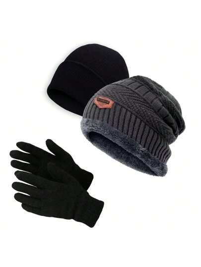 Kit Inverno 1 Touca Lisa Preta + 1 Touca De Pelinhos + 1 Luva Lisa Preta - Cinza - Visão 1