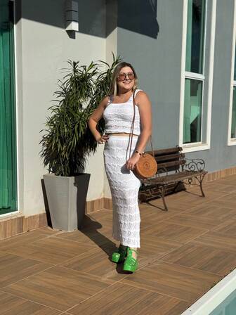 Conjunto Tricot Branco Feminino Saia Longa e Cropped Rendado Verão Conjunto de Tricot Saia e Blusa Feminina Malha Trabalhada Look Casual Praia e Festa Moda 2025