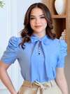 Blusa Social Manga Curta Bufante com laçinho Lisa Social Elegante Moda Evangélica Estilosa
