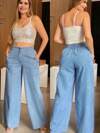 CALÇA JEANS PANTALONA WIDE LEG CINTURA ALTA COM ELASTICO NO CÓS E BOLSOS