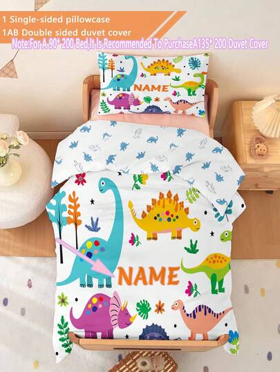 2PCS Personalized Customization Customized Cartoon Colored Dinosaurbedding Set Double-Faced Printing Customized Bedding Set(1 Single-Sided Printed Pillowcase+1 Double-Sided Printed Duvet Cover), Autumn New Arrivals Suitable For Student Dormitory (The Pillowcase Size Of 90 * 200/135 * 200 Is 50 * 75) - Multicolor - View 1