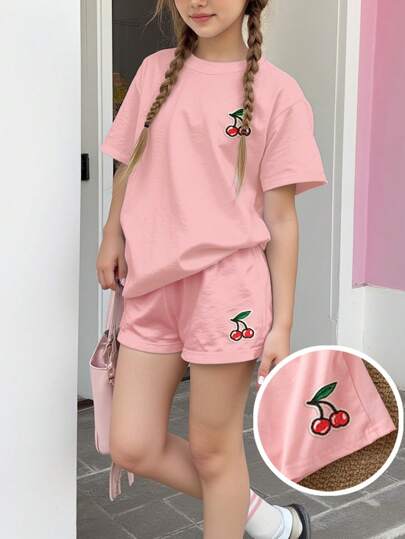 SHEIN Leap Crew 2pcs/Set Tween Girls Casual Minimalist Short Sleeve Shirt And Shorts Set, Suitable For Summer - Pink - View 1
