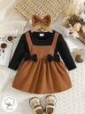 Infant Girls' Fashion Elegant Collared Puff Sleeve Splice 2 In 1 Ribbed Suspender Check Bow Jumpsuit With Headband, Summer