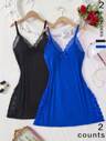 2pcs Lace Patchwork Bow Decor Romantic Side Slit Cami Nightgown