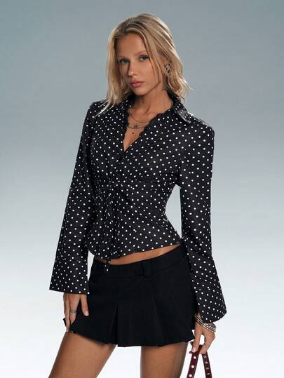 SHEIN TRNDY Women's Polka Dot V-Neck Lace Patchwork Slim Fit Long Sleeve Blouse, Suitable For Office Wear, Graduation Ceremony, Back To School - Black and White - View 1