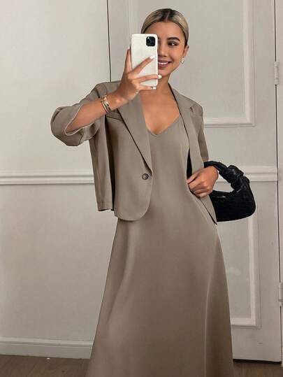 DAZY Women's Solid Color Loose Elegant Autumn Suit Set: Blazer Jacket And Maxi Dress Business Attire - Khaki - View 1