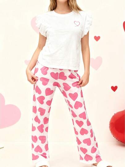 Women's Valentines Clothing Set Fashionable Heart Printed Ruffle Sleeve Tank Tops With Pants 2Pcs Outfits - Pink - View 1