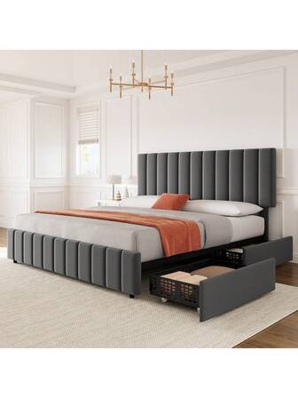 Linen Bed Frame With 4 Storage Drawers, Upholstered Platform Bed Frame, Adjustable Height Headboard, No Box Spring Needed, Easy To Assembly, Grey