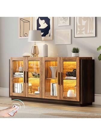 Merluxy Sideboard Buffet Cabinet With LED Lights And Adjustable Shelf, Modern Mixed Color Accent Cabinet With Glass Doors, Functional Storage Console For Dining Room Or Living Room