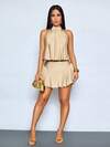 SOLERSUN Spring/Summer Women's Wear: Elegant And Stylish, Perfect For Casual Wear, Parties, And More. Apricot-Colored, Knitted, Stretchy, Lustrous Fabric. Halter Neck, Sleeveless, Backless, Ruffled Hem. Short Jumpsuit.