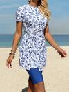 Swim Mulvari New Summer Women Round Neck Short Sleeve Waist Twist Lock Side Slit Floral Print Dress & Solid Color Bermuda Shorts Casual Vacation Bikini Set