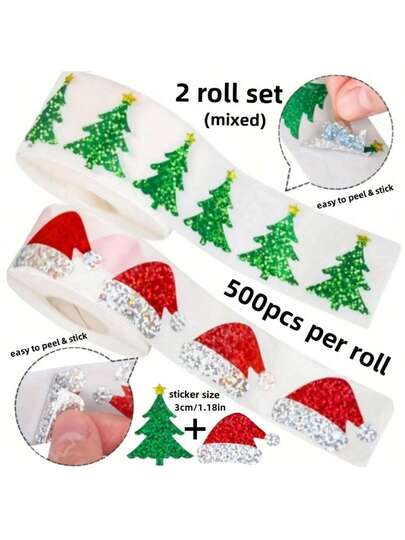 2 rollos de 1000 pegatinas navideñas surtidas, árbol de Navidad verde holográfico de 3 cm/1,18 pulgadas y rollos de pegatinas autoadhesivas con gorro de Papá Noel rojo, pegatinas decorativas navideñas, sellos para envolver regalos de Navidad, pegatinas decorativas, pegatinas de PVC resistentes al agua adecuadas para Navidad - Multicolor - Añade 2