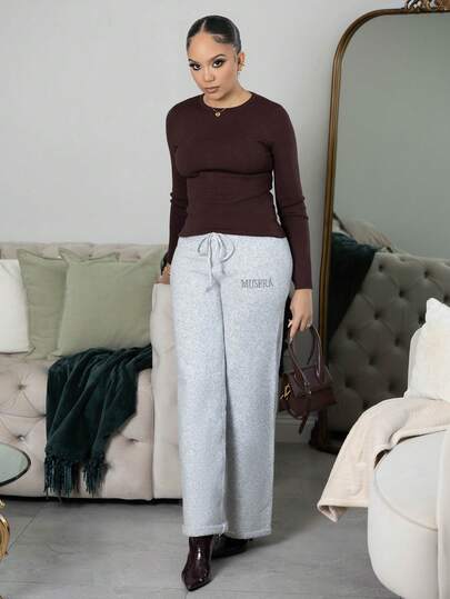 Melissa Matos Jersey de cuello redondo de manga larga tejido, casual, elegante para vacaciones, aeropuerto, días festivos, otoño, invierno, Navidad - Café integral - Añade 1