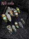 10 piezas Conjunto de uñas postizas estilo coreano con tacón alto y delgado, decoración 3D en dorado, marrón, verde, estilo Y2K, cobertura total, para expresar tu amor. Estilo europeo punk, ojos de gato marrones, estilo princesa bohemia, decoración de festival de música nórdica, cobertura total, adecuado para niños y niñas, incluye 1 lima de uñas mini y 1 etiqueta adhesiva de doble cara.