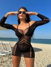 Vestido corto de playa con diseño de anillo metálico transparente y calado, de manga larga, unicolor, sexy, para mujer, ideal para primavera/verano y vacaciones