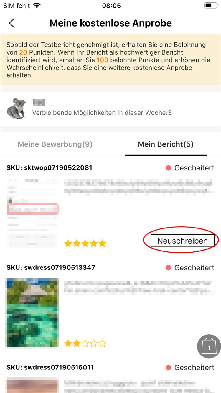 Wenn du den Testbericht nicht hochladen kannst, überprüfe, ob der eingegebene Link korrekt ist - dieser führt zum Probeartikel. Die Bildgröße beträgt mindestens 500*680px. Wenn du es immer noch nicht hochladen kannst, sende bitte die Bewertung, Bilder sowie Screenshot der Fehlerseite an unsere SHEIN Kundenservice . Wir werden es überprüfen und so schnell wie möglich helfen.