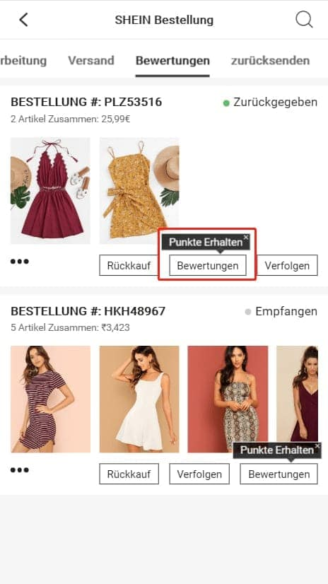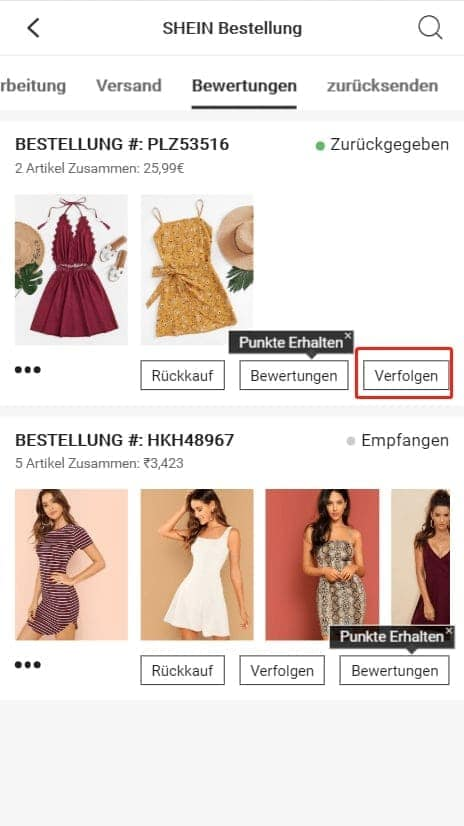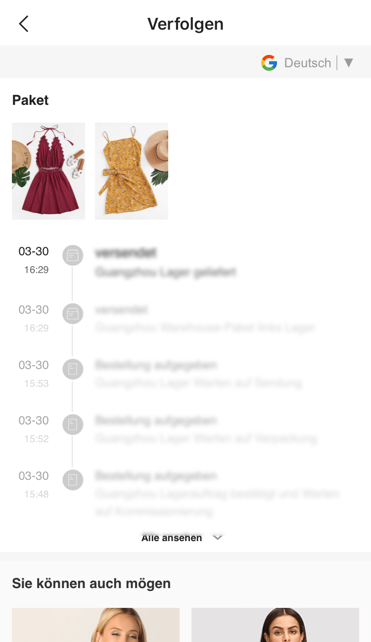 Wenn Ihre Bestellung “Versandt„ ist, können Sie auf “Verfolgen„ klicken um den aktuellen Status Ihres Pakets zu sehen.
