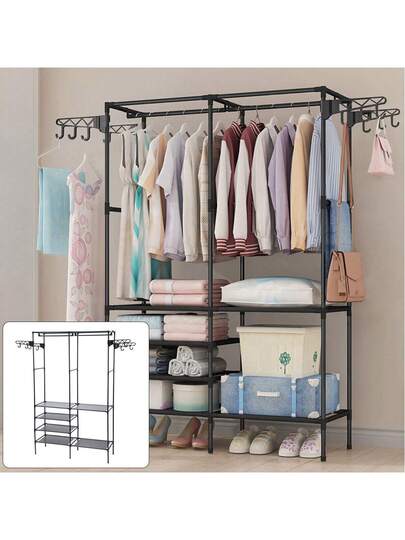 OYAJIA Kleiderständer mit Ablage und Haken, Kleiderstange Garderobenständer Hängeregal Standregal Schuhablage, Schwarz - Schwarz - Übersicht 1