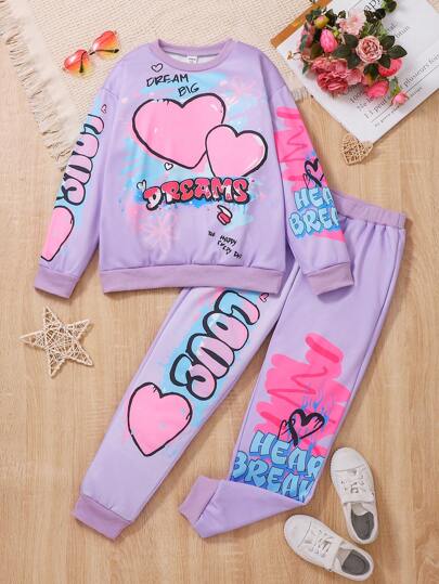 SHEIN 2 Stücke/Set Sweatshirt mit Herzdesign und Rundhalsausschnitt und lange Jogginghose für Tween-Mädchen, süßer Outfit - Mauve - Übersicht 1