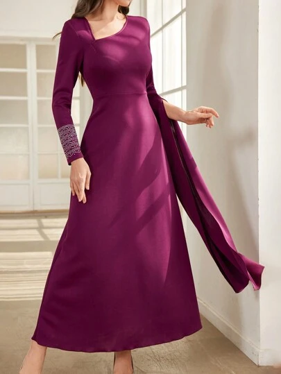Modelyn Damen elegantes, asymmetrisches Ärmellang Kleid mit Strass Verzierung, extra lange Maxikleid Damen Outfit für festliche Anlässe - Violett - Übersicht 1