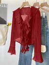 Siren Gaze Damen einfarbige Spitze Rüschen Rundhals Bluse, Glockenärmel, elegantes Hemd, einfarbige Rundhals Rüschen Top, geeignet für Raves, Musikfestivals, Ibiza, Coachella, kann als Oberbekleidung getragen werden, mehrlagige Rüschen Bluse, Rüschen Top, tailliertes Hemd, Sommer