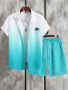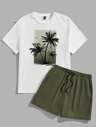 Manfinity Chillmode Conjunto de camiseta de manga corta y pantalones cortos con estampado de árbol de coco para hombres de talla grande, conjunto de ropa informal y cómoda para vacaciones