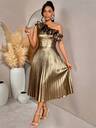 Vestido midi elegante de línea A con volantes y pliegues en color rojo para mujer, ideal para bodas, fiestas y cócteles
