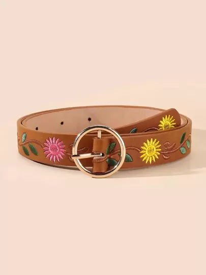Cinturón de mujer con hebilla de metal y bordado de flores (incluye perforador de agujeros) para Halloween, Día de San Valentín, verano, escuela, otoño - Camel - Ver 1