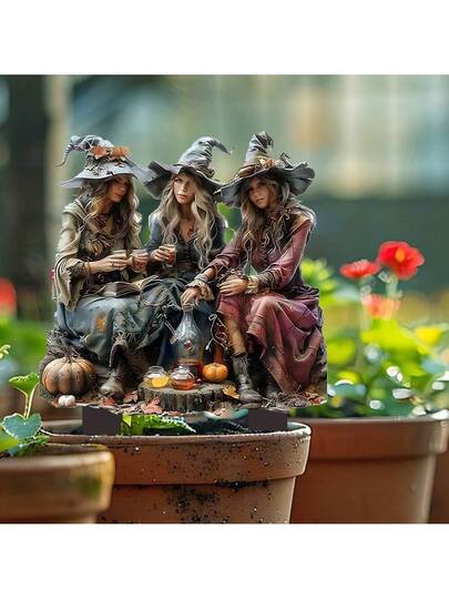 2D Flat, A 2D Acrylic Flat Design Depicting A Witch's Garden Decor, Showing A Scene Of Three Witches Holding A Magic Tea Party, Suitable For Indoor And Outdoor Decoration. Ideal For Halloween, Fairy Tale Garden, Potted Plants And Fairy Garden Accessories - A - View 1