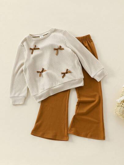 2pcs/Set Girls' Textured Knit Pullover T-Shirt Top And Wide-Leg Knit Pants Outfit, Suitable For School, Holidays, Casual Daily Wear - Multicolor - View 1