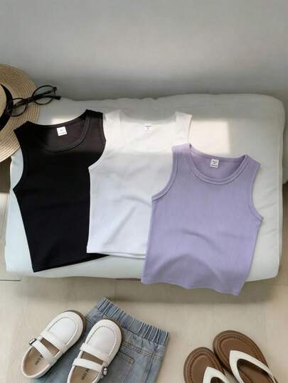 SHEIN Playful Pals 3pcs/Set Girls' Solid Color Round Neck Simple Fashionable Versatile Camisole, Summer Ribbed Tank Top 3 Pack Tops Basic Tops Summer Tops - Multicolor - View 1