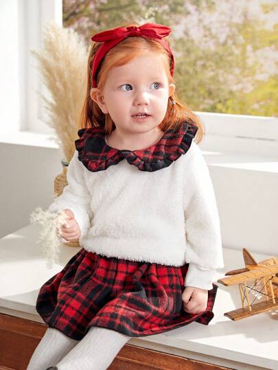 SHEIN BABYGIRL 2pcs/Set Fluffy Top With Special Ruffle Collar And Plaid Pleated Skirt, Fashionable Outerwear Set, Autumn/Winter - White - View 1
