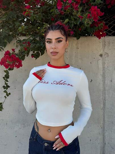 Bearsaez Contrast Trim Vintage Letter Print Slim Fit Long Sleeve White T-Shirt - Red and White - View 1