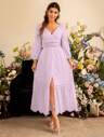 Simplee Plus Size Women's Solid Color Shiny Cape Sleeve Waist Metal Decor Slit Hem Elegant Maxi Dress, Evening Gown, Birthday Party Dress, Wedding Guest Dress, Red Christmas Dress