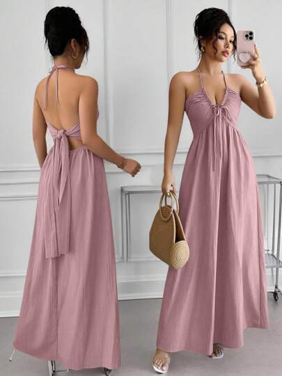 Rafferiza Solid Color Halter Backless A-Line Dress - Pink - View 1
