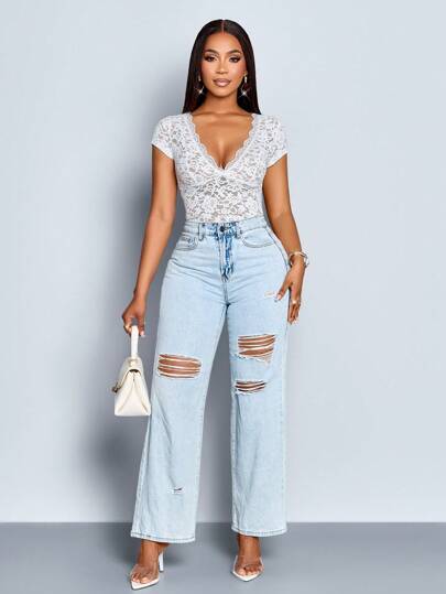 SOLERSUN Spring And Summer Women's Wear Daily Leisure Sexy Commuter White Lace Fabric V-Neck Neck Lace Short Sleeve Fitted Top - Apricot - View 1